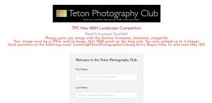 From the email address you entered during the upload, send an email to contest@tetonphotographyclub.org with the subject line: X images Where X is the number of images you uploaded. So if you uploaded 2 images, your subject line would be: 2 images. Don’t write anything in the body of the email unless you have had trouble. If you have trouble you may use that email address to seek assistance.